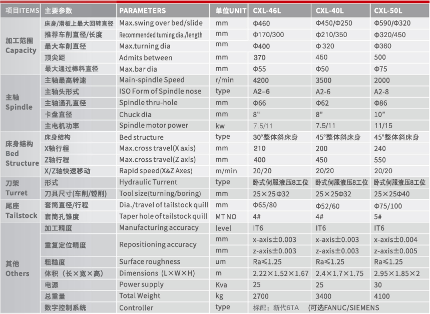 简要描述:  ★机床简介:  CXL-40L/46L/50L数控卧式车床是结合我厂多年设计的经验,顺应市场及发展需求而设计、生产的全新产品。该产品主要性能指标大道国际先进水平、节能、环保。 ★与同类机床相比具有如下特点: ? 高效率:加工周期短,减少非...